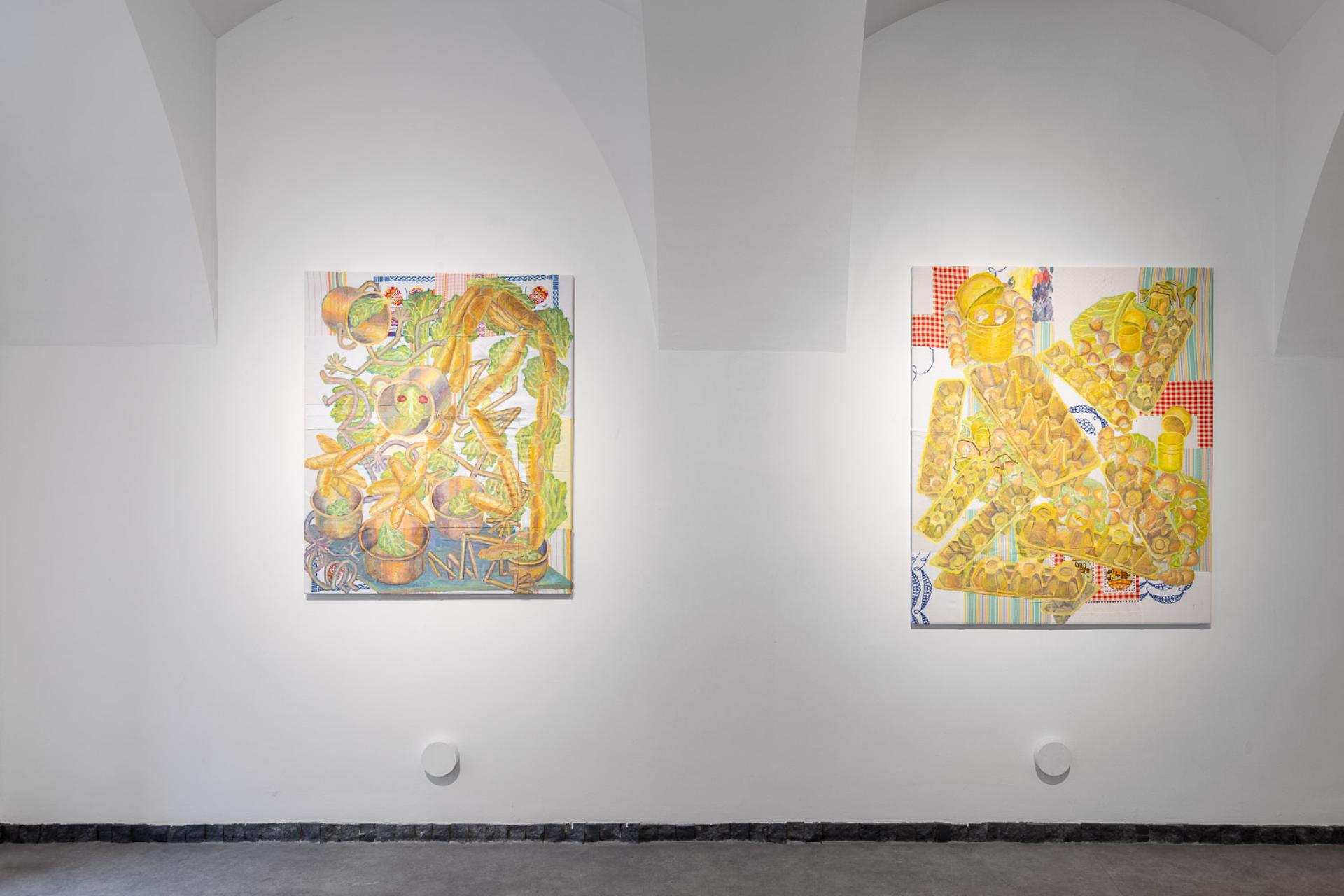 Domáce náčinie a jedlo, ktoré žena každodenne pripravuje, ju však už neobklopujú, ale samé ožívajú v antropomorfných postavách, pripomínajúcich portréty manieristického umelca Arcimbolda z ovocia či zeleniny. Starostlivosť o deti a domácnosti je nekonečnou prácou, ktorá môže mať za následok tiché, postupné rozplývanie identity. Preto je možné postavy čítať aj opačne, nie ako oživené kulisy domácnosti, ale ako bytosť stratenú v opakujúcich sa činnostiach.