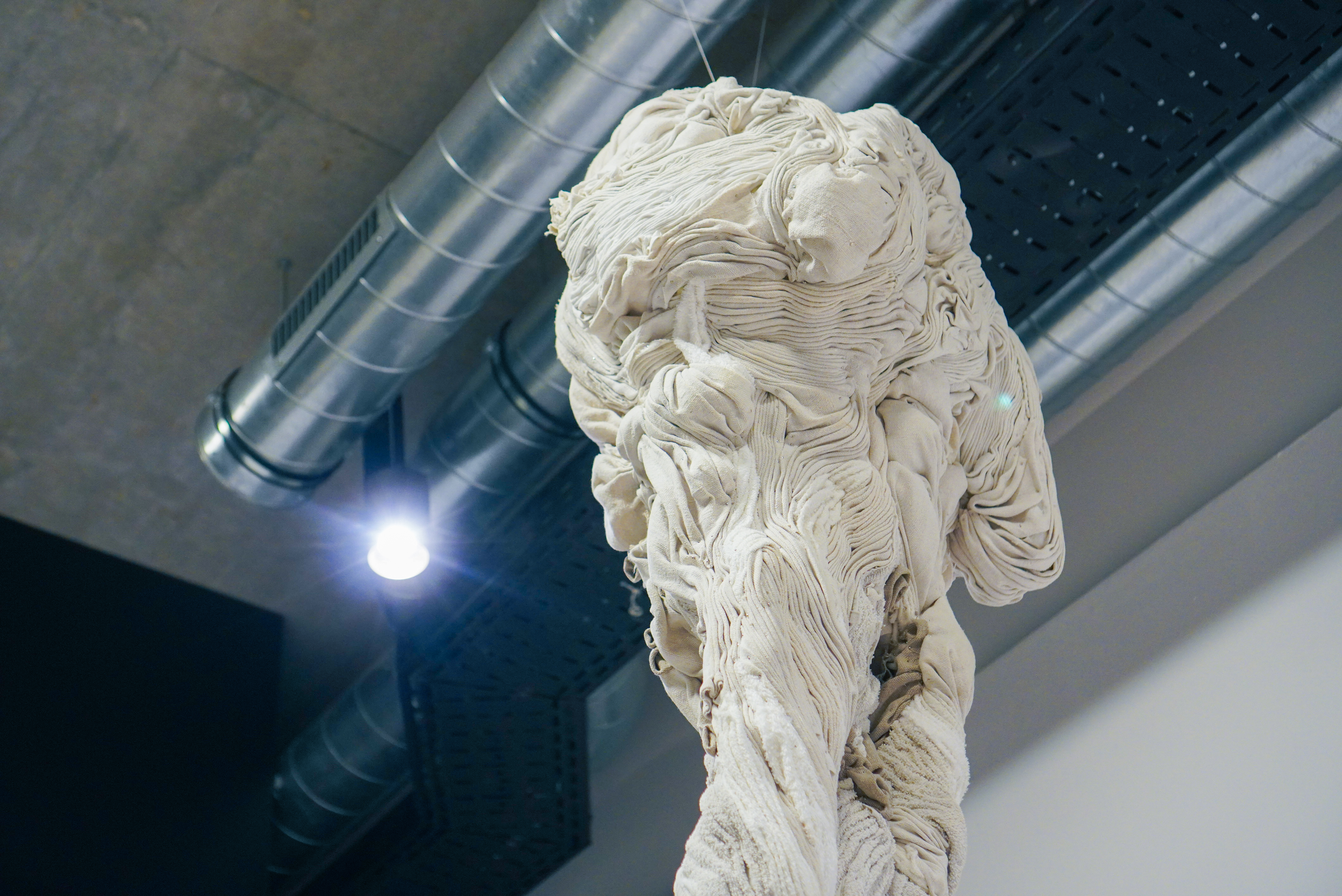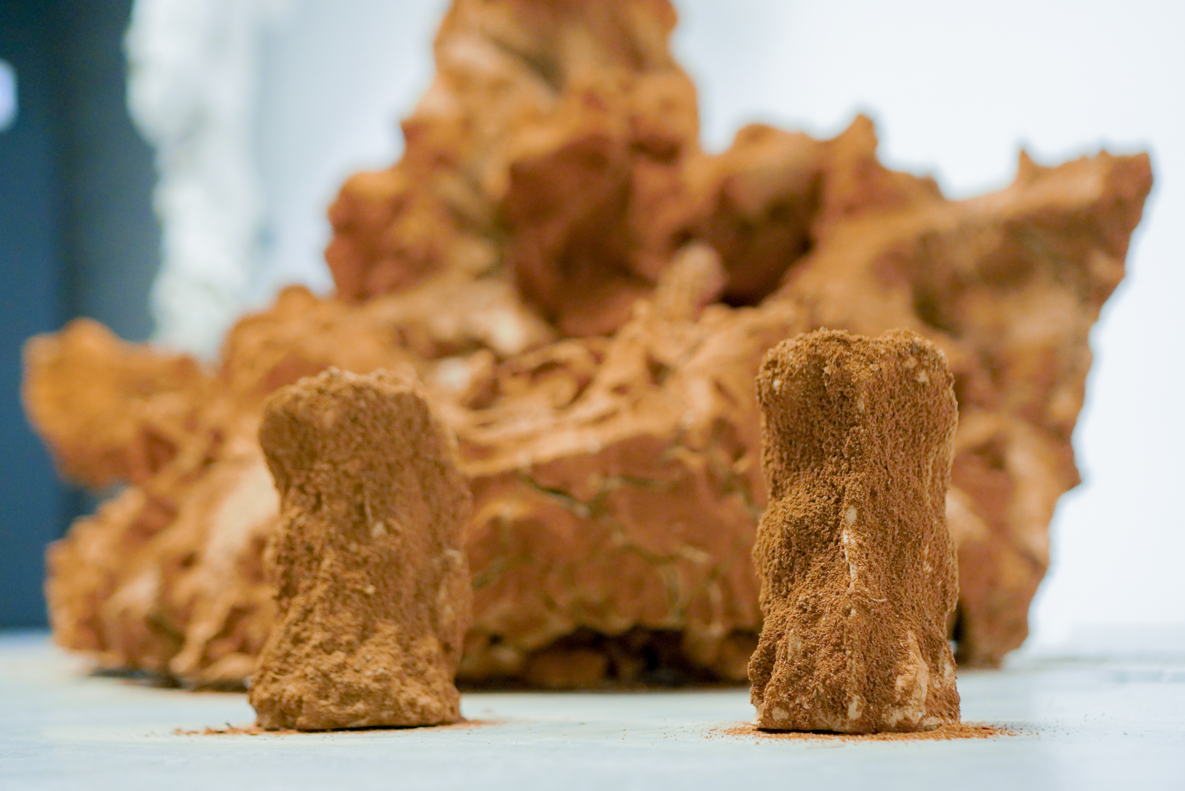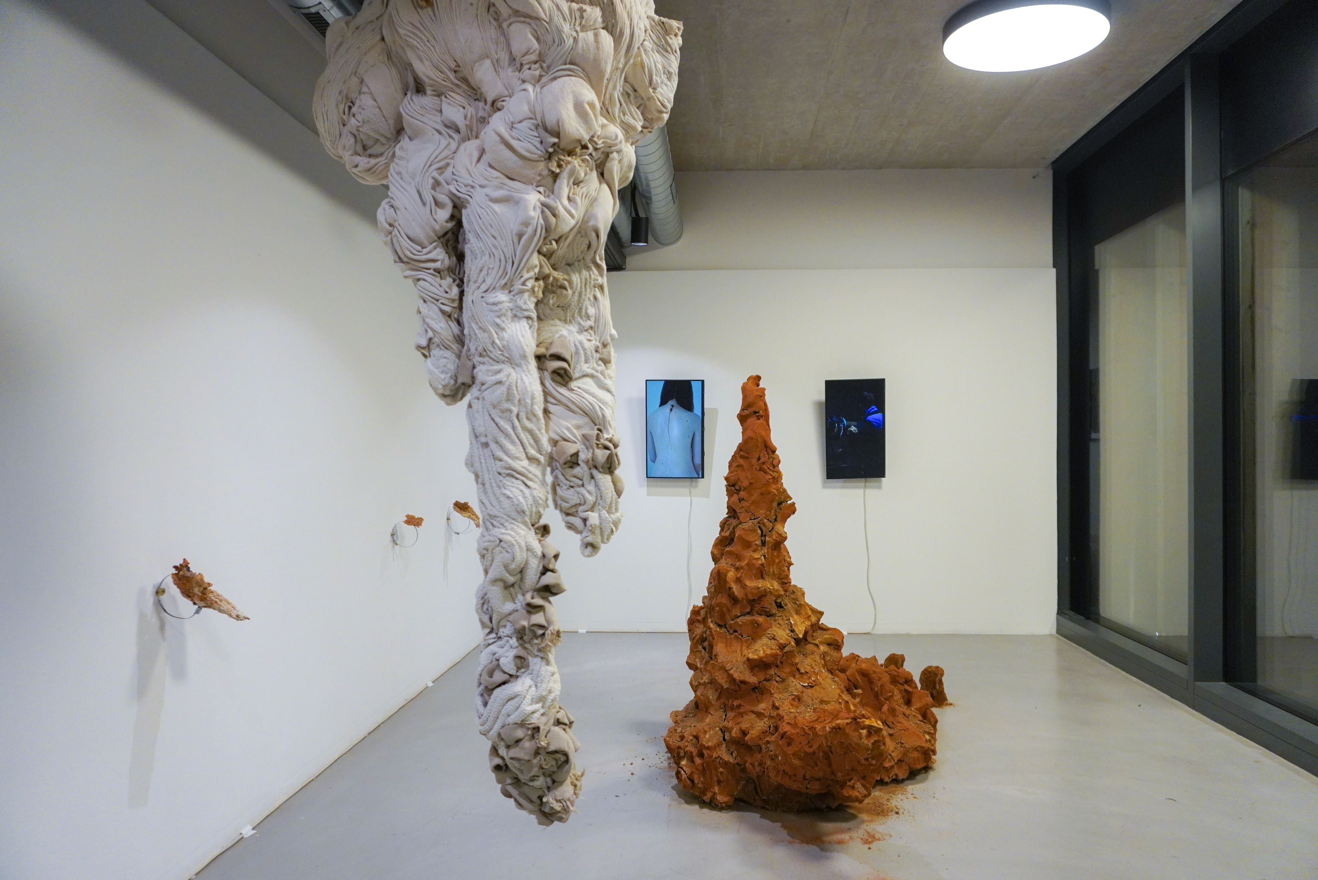 Materiálne fragmenty pochádzajúce priamo z kúpeľov, miesta oddychu, prinášajú do galérie únavu, no paradoxne jej cieľom nie je pohltenie diváka, ale zmena rámca uvažovania. Sedimentárna hornina pochádzajúca z útrob priestoru pod bazénom s liečivou vodou nesie v sebe zmyté stopy únavy všetkých ľudí hľadajúcich starostlivosť v kúpeľoch Sliač, ak nie exaktne, tak aspoň symbolicky. Zmineralizovaná únava sa premieňa na pôsobivý, farebný kameň rôznych tvarov a výrastkov, upevnený na stene pomocou hadicových spôn, odkazuje na bazénovú technológiu vyžadujúcu si starostlivosť a údržbu. V každej vrstve sedimentu sa prejavuje časovosť a život architektúry, návštevníkov aj pracovníkov. Zároveň ruky údržbára ukazujú jeho oddanosť každodennej starostlivosti o chod bazéna. Dlhá jazva na chrbtici plačúca liečivý sediment nám pripomína čas, ktorý si vyžaduje starostlivosť a liečba v priamom odpore voči spoločenskej akcelerácii, keď sa zdá, že časom už nedisponujeme. Objekty vytvárajúce metaforu stalagmitu a stalaktitu priamo narúšajú časovosť akcelerácie a pripomínajú ich formovanie trvajúce roky, a ktoré bude trvať aj po našich životoch. Rovnako ako letokruhy stromov zachytávajú udalosti a katastrofy ovplyvňujúce ich rast, tak sa aj do sedimentu usádzajú časy. Verešová však na vytvorenie jaskynných útvarov použila sedimenty únavy – uteráky a prášok pomletý zo sedimentárneho kalu liečivých vôd získaný priamo z kúpeľov nesúci stopy tiel hľadajúcich liečbu. Hlinený stalagmit postupným vysychaním počas trvania výstavy praskal a upozorňoval na krehkosť tela, ktorú prináša únava, či už pri telách živých alebo neživých.