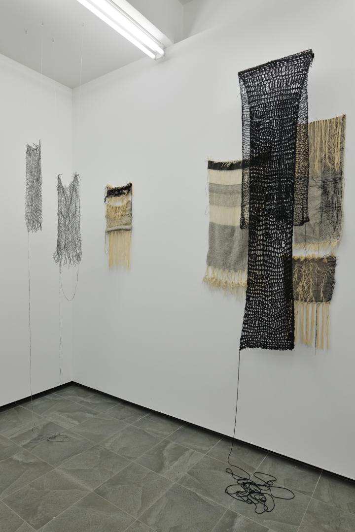 Výstava s názvom Povol(n)iť sa skladá z dvoch častí. Jedným je dielo, ktoré vzniklo v roku 2023. Druhé sa deje aktuálne v priebehu posledných mesiacov na prelome rokov 2025/26. Je neustále v procese. Obidve vedú vzájomný dialóg, aj keď to na prvý pohľad nemusí byť úplne zrejmé. Dôležitou súčasťou sú aj textové záznamy, denníky, skicáre, ktoré autorka vytvárala počas obdobia posledných 3 rokov. Zápisky ukotvujú prvé dielo v hlboko osobnej skúsenosti straty, ktorá však nemá podobu náhleho konca, ale skôr postupného miznutia. Postava starej mamy tu vystupuje ako tiché centrum, územie pokoja, starostlivosti a nehodnotiacej prítomnosti. Vytvára priestor, ktorý nie je viazaný len na konkrétne miesto, ale na vzťah. Ten pretrváva aj v momente, keď sa pamäť pod náporom choroby rozpadá, identita sa vytráca. Textil v tomto kontexte nadobúda charakter medzigeneračného dedičstva. Nie je len technikou či remeslom. Stáva sa formou pamäti, ktorá sa odovzdáva prostredníctvom tela, rúk a dotyku. Telesné vedomie uchováva v sebe skúsenosť aj keď myseľ zlyháva. Druhá časť prezentovaných prác túto skúsenosť nerozvíja naratívne. Presúva ju do roviny procesu. Autorka tu reflektuje vlastný vzťah k textilu ako k médiu vyžadujúcemu si čas, pozornosť a schopnosť spomaliť. V kontexte predchádzajúcej skúsenosti sa spomalenie neukazuje len ako pracovná podmienka, ale ako etická nevyhnutnosť. Spôsob, akým je možné zotrvať pri veciach, ktoré sa nedajú urýchliť ani uzavrieť. Do popredia sa dostáva i strach. Strach z rozhodnutí, z nevhodne použitého materiálu, z chýb, z nedostatočnosti. Stáva sa silnou stopou prameniacou z predchádzajúcich skúseností. Objavuje sa ako tieň v osobných zápiskoch. Vnútorný hlas, ktorý na jednej strane sprevádza samotný proces tvorby, no zároveň ho aj brzdí. Nechce ho fixovať, snaží sa ho opustiť a transformovať. Textilná práca sa tak môže stať miestom, kde sa autorka pokúša vnútorný konflikt postupne rozvoľňovať. Povoliť.