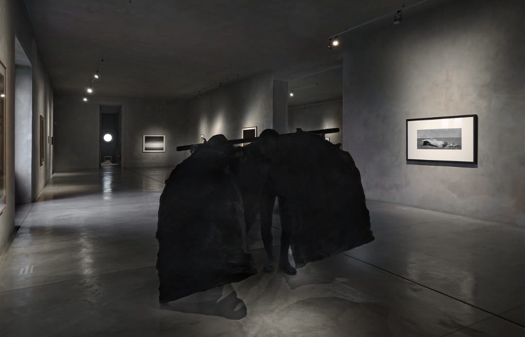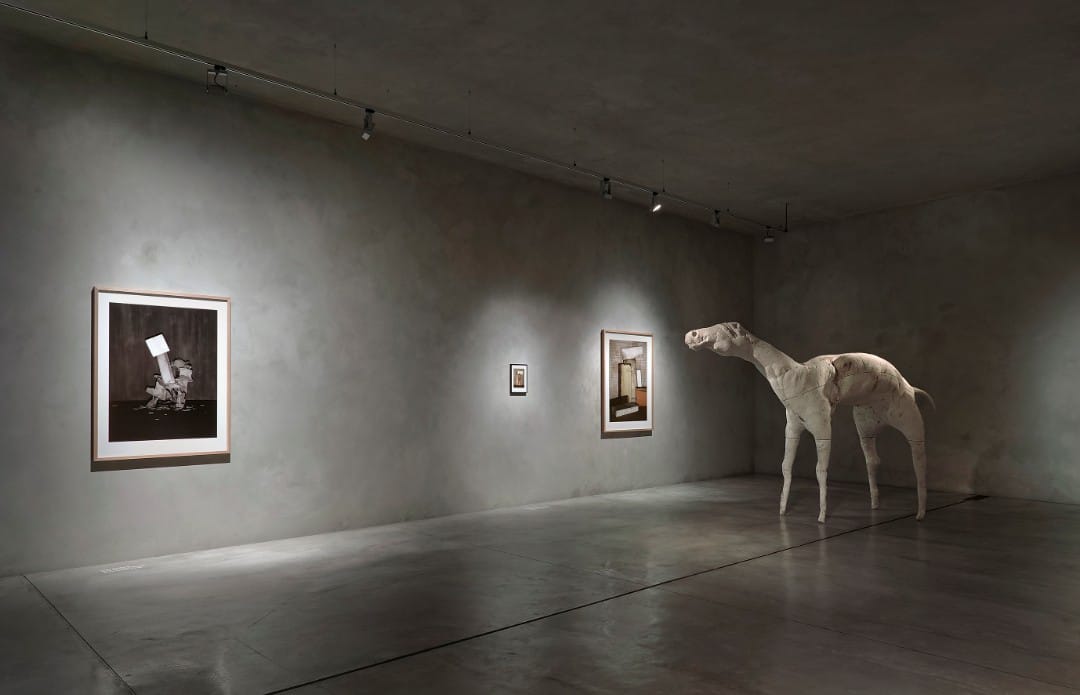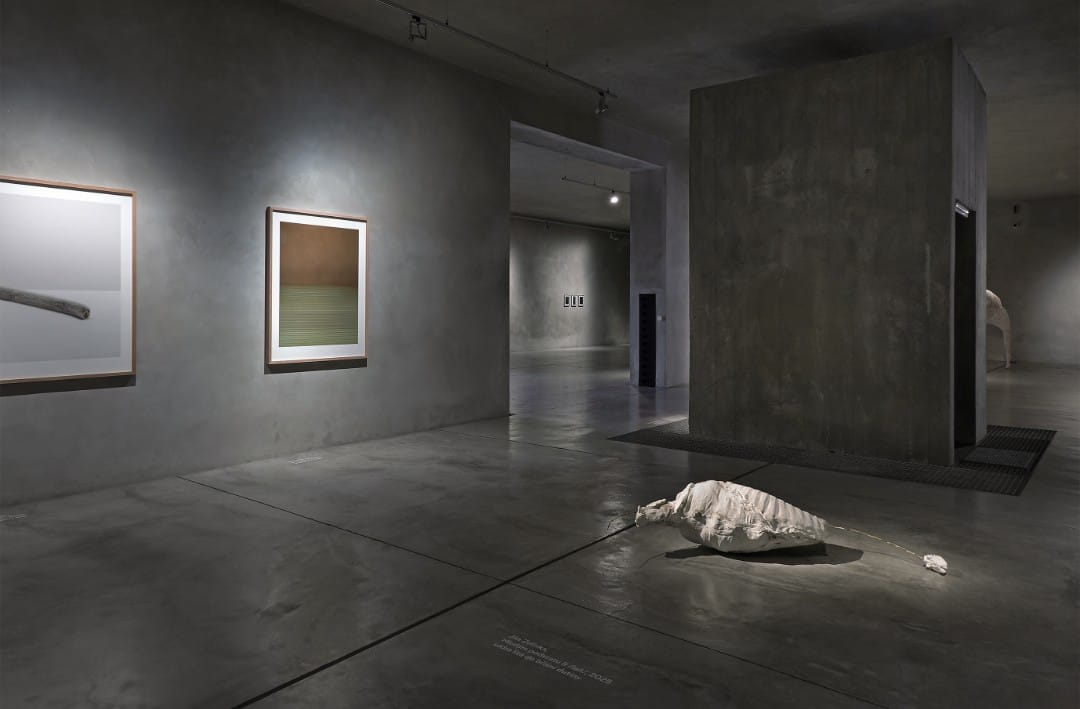 Pinkavu v súčasnosti zaujímajú aj konfrontácie a interakcie jeho fotografických diel s inými médiami, predovšetkým so sochárskou tvorbou (Eliáš Dolejší – 2018, Ondřej Filípek – 2022, Kateřina Komm – 2024/25). Aj tým asi môžeme vysvetliť účasť Jána Zelinku na výstave, ktorá bola prekvapením pre všetkých zúčastnených. Zelinkovu tvorbu možno charakterizovať ako neúnavné hľadanie nového výtvarného jazyka, ktorý spolu s hĺbkovým ponorom do tém týkajúcich sa človeka a telesnosti vytvára záznamy existencie a pracuje s polaritou prítomnosť verzus neprítomnosť. Sochár sa invenčne pohybuje medzi kresbou, sochou a objektom; testuje krehkosť a trvanlivosť, vytvára odtlačky, odliatky, stopy a záznamy tela, zaujíma ho pamäť a jej uchovávanie. Na výstavu boli autorom vybrané sadrové objekty Hľadám podstatu I. a II. – výliatok telesného objemu z kože koňa (2014) a výliatok brušnej dutiny lane (2025) – ako aj olovené sarkofágy Rekviem pre veveričku (2014) a mimoriadne pôsobivé Rekviem pre včeliu rodinu (2018). Hoci ide o exaktné až naturalistické formy, výsledné objekty pôsobia prekvapivo surreálne. Najslabším miestom Zelinkovho autorského výberu – a, žiaľ, aj celej výstavy – je inštalácia Dáma z New Yorku (2020). Hoci jej tematickému východisku (subtílna ženská postava nesúca na palici prehodenej cez ramená obrovské čierne vrecia preplnené plastovým odpadom), technologickému spracovaniu (použitie technológie flock – striekaného zamatu – a plastového odpadu zbieraného na ilegálnych skládkach) ani ideovej rovine nemožno nič vyčítať, do lounskej výstavy sa jednoducho nehodí. V inak dokonale vyváženom celku pôsobí ako rušivý akcent, ktorý na seba neprimerane púta pozornosť, vymyká sa metaforickému a naznačenému kontextu výstavy a posúva sa do rozpačitého verizmu. Spojenie fotografie a sochy funguje vo všeobecnosti veľmi dobre – ako symbiotická polarita plošného a priestorového. V prípade Pinkavovho pozvania Zelinku však nejde len o formálny dialóg médií, ale aj o zdieľaný motív pominuteľnosti a premeny. Zelinkove diela nesú špecifické memento mori, reziduálnu krásu vecí opotrebovaných časom a dočasne obývajú priestory lounskej galérie vymedzené fotografovými obrazovými fantáziami.